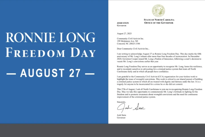 Josh Stein, Governor of North Carolina has proclaimed that August 27 will hereafter be recognized as Ronnie Long Freedom Day. On August 27, 2020, Ronnie Long was finally released from prison following a wrongful incarceration that spanned 44 years, 3 months, and 17 days. Following his release from prison, Mr. Long was granted a Pardon...